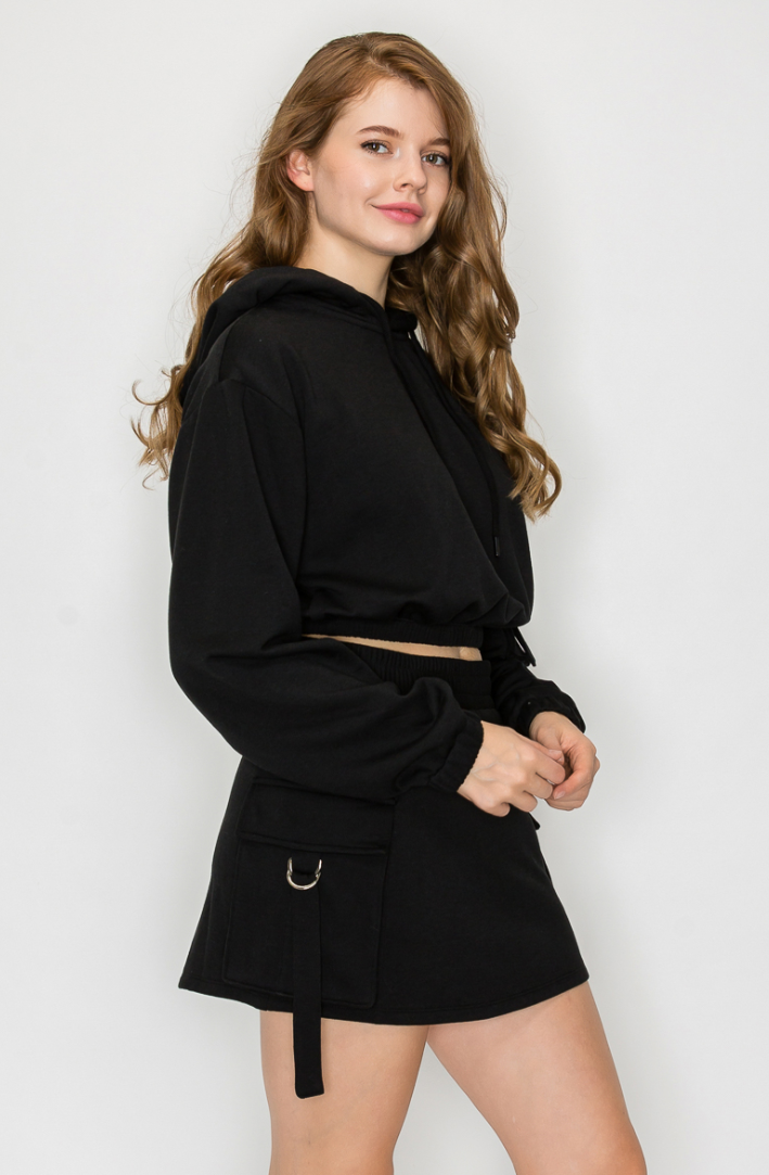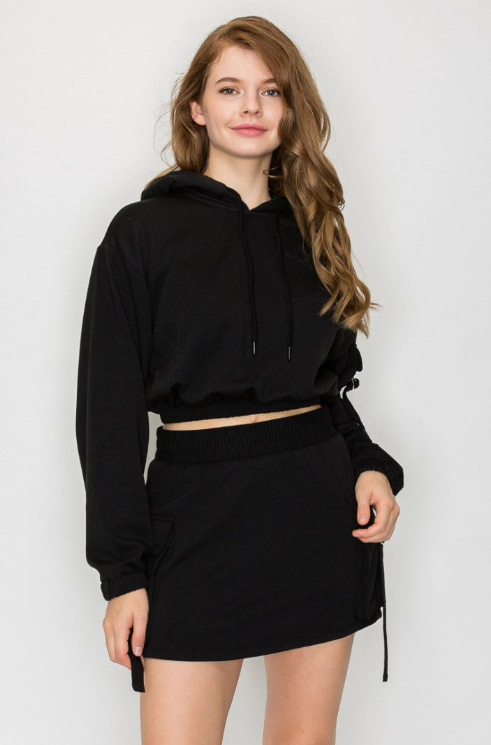 This sleek hoodie top in a solid color features a drawstring for an adjustable fit and long cuffed sleeves with pocket detailing for added style. Designed with a relaxed fit, it offers comfort and a laid-back look. The elastic hem adds structure and ensures a secure fit. Perfect for casual outings or lounging, this hoodie blends fashion with functionality, making it a versatile addition to any wardrobe.