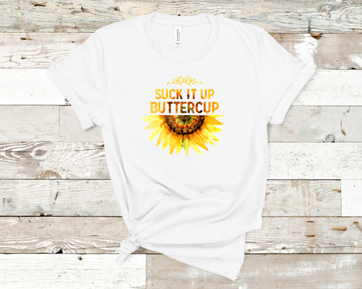 Sublimated "Suck it up, Buttercup" on our white unisex tee.