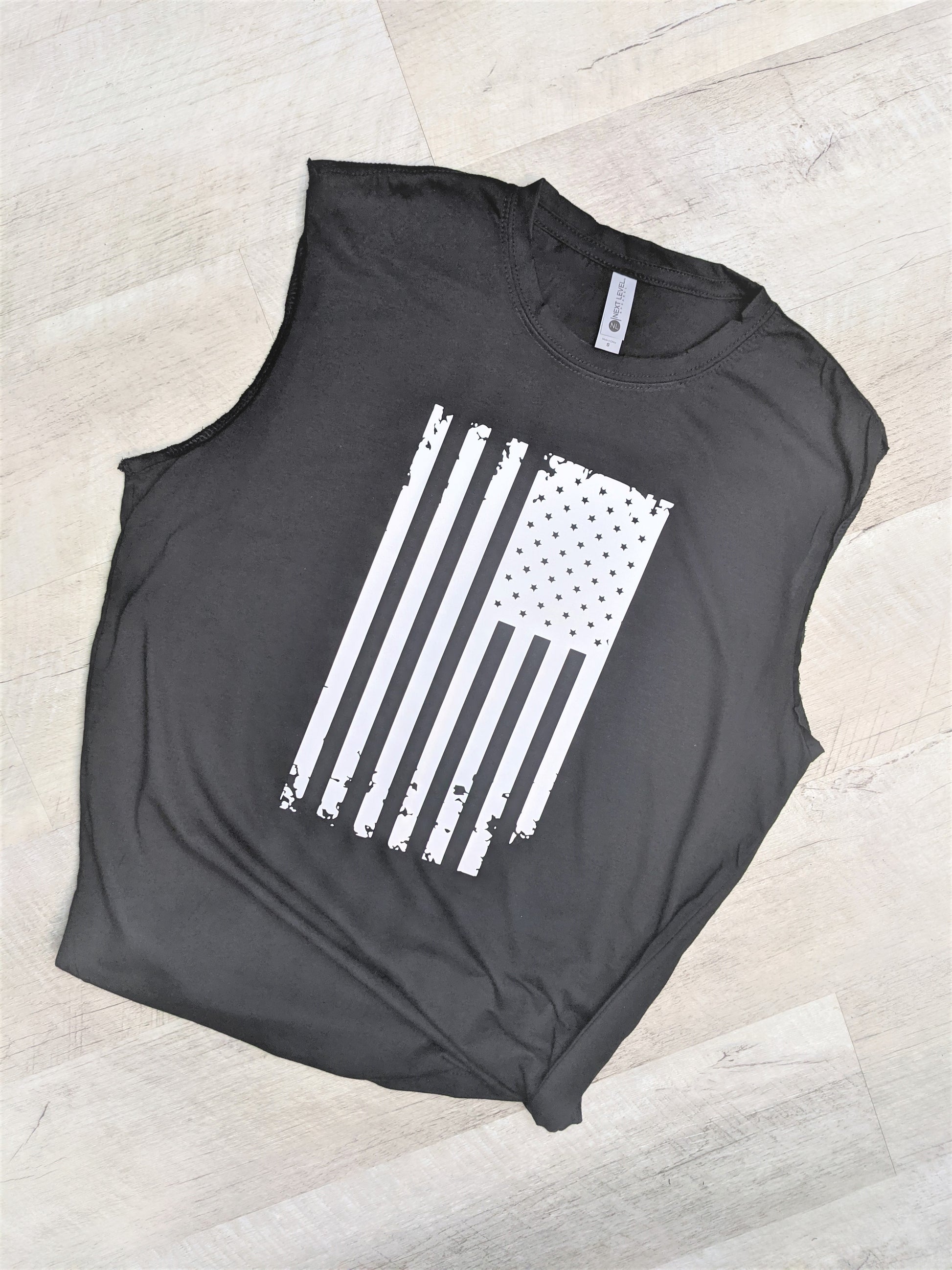 Our new distressed muscle tank is perfect for summer. Nice lighter weight fabric to keep you cool and light distressing at the sleeve and neck hems.
