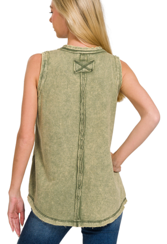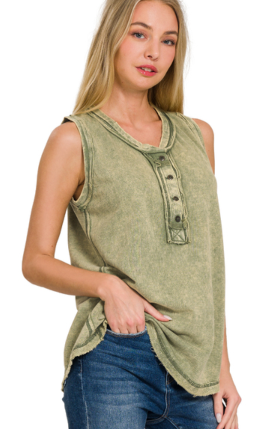 WASHED HALF-BUTTON RAW EDGE SLEEVELESS HENLEY TOP