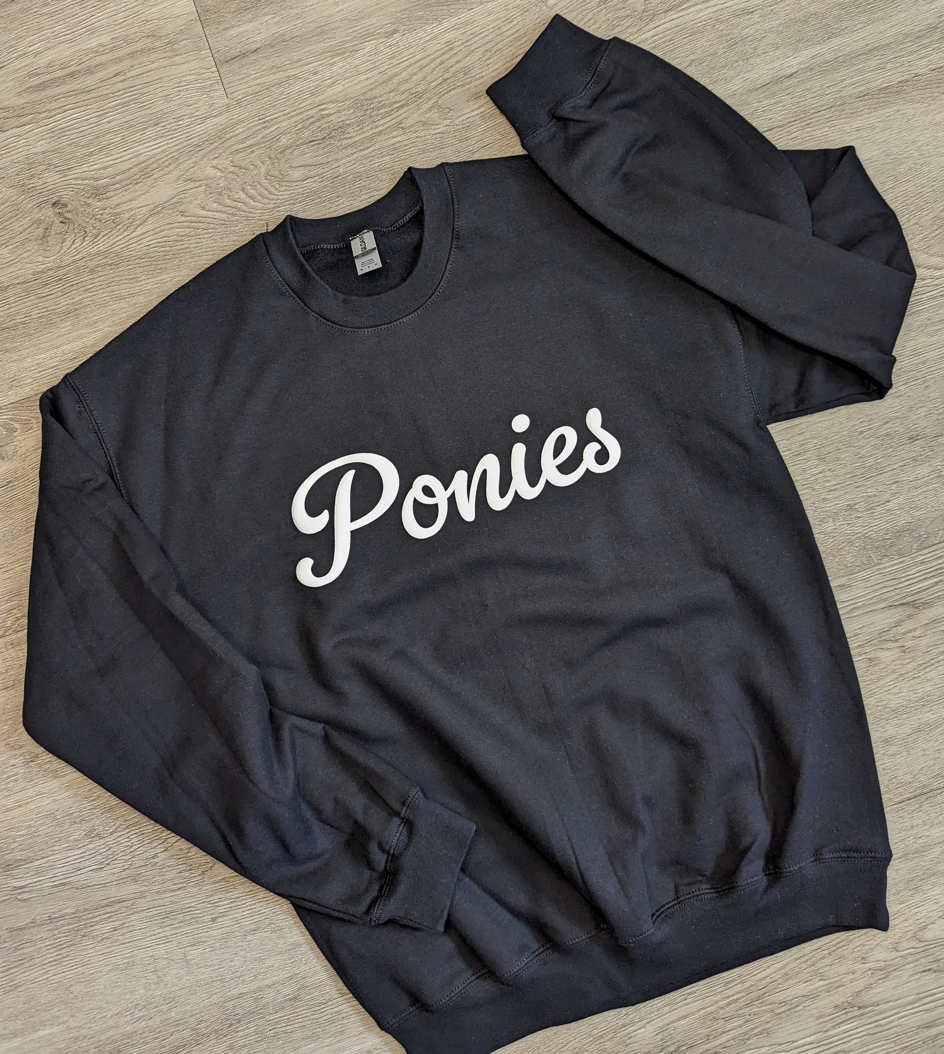 Our signature Rags crewneck with a ponies puff texture.