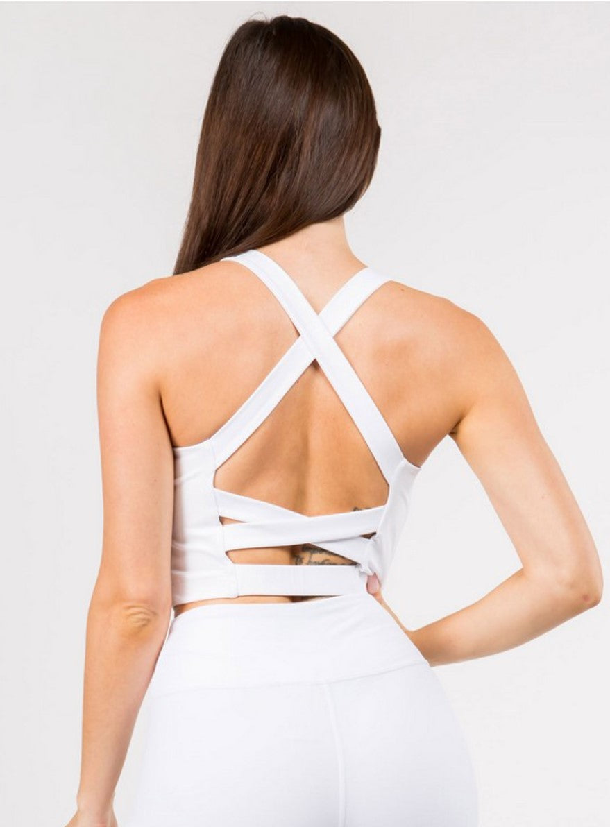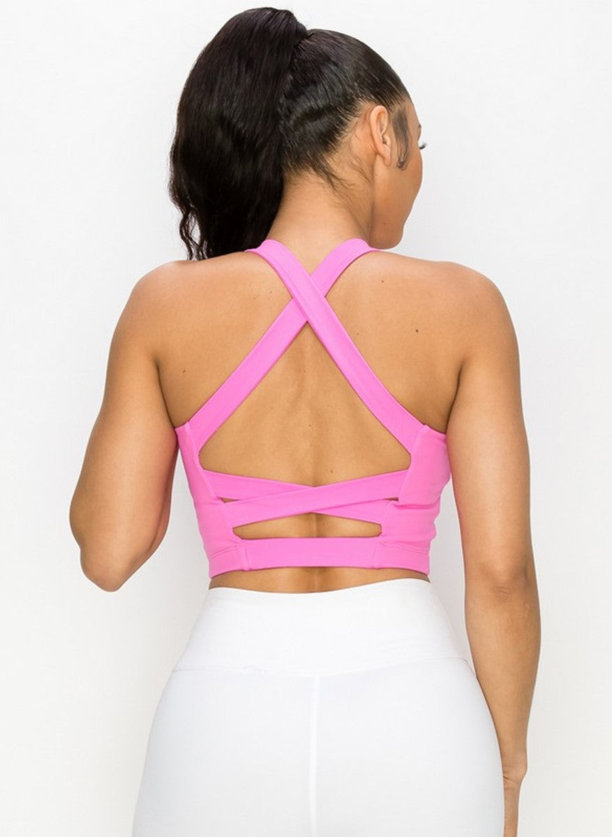 The perfect bra top for your next workout is here! Our active sports bra features a high round neckline, two removable cups with a soft mesh lining along the bodice, and a crisscross, strappy back design.
