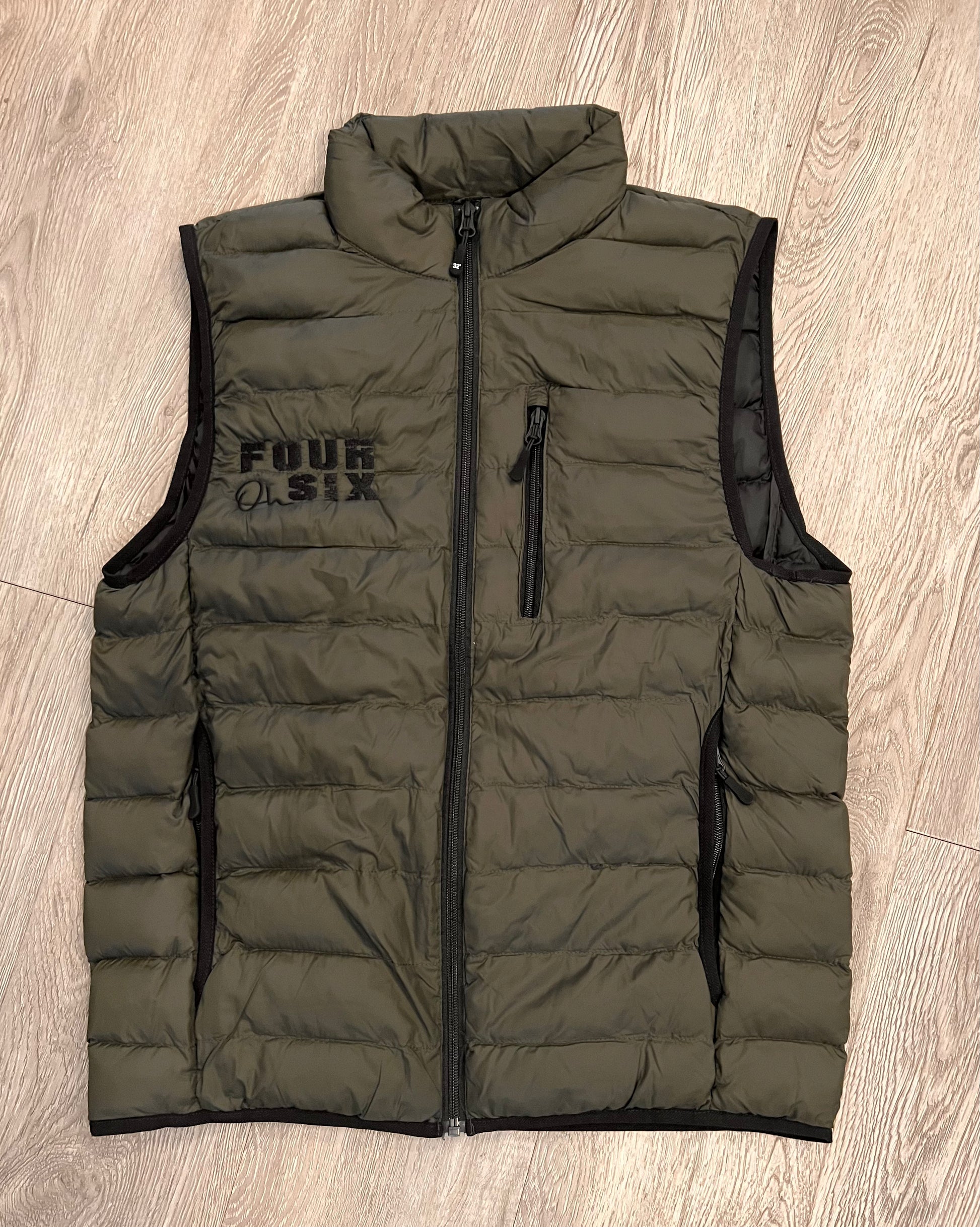 Lightweight warmth. Stand up collar, center front zipper closure. Straight channel quilting with flattering side panel