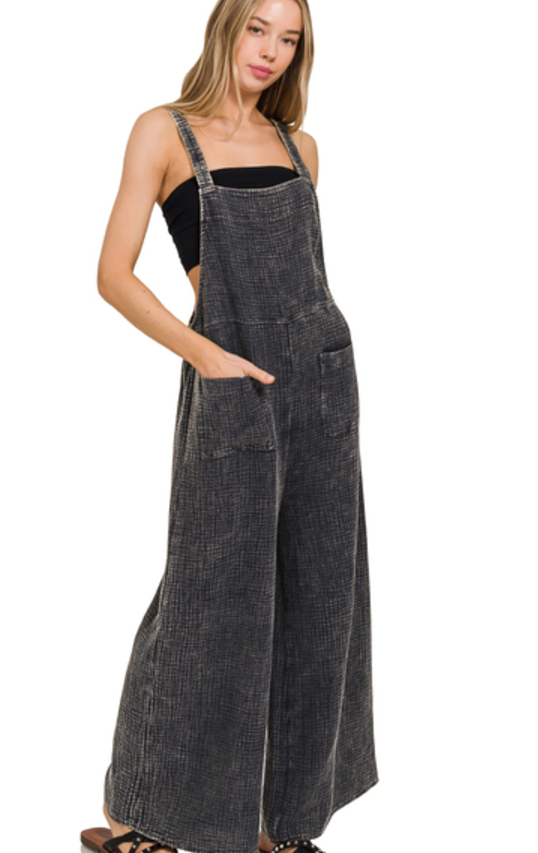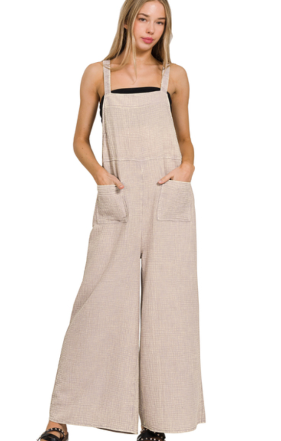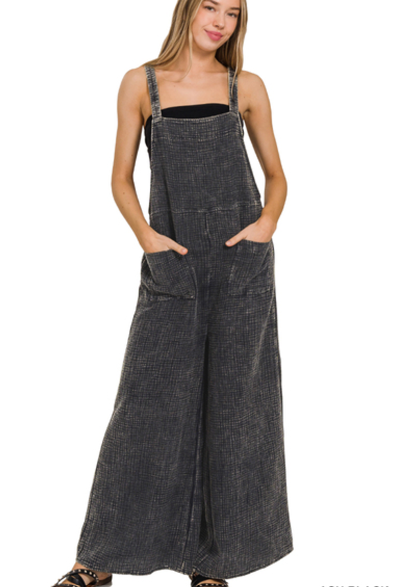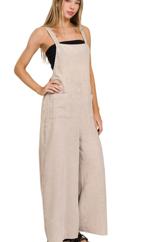 WASHED DOUBLE GAUZE ELASTIC WAIST WIDE LEG OVERALLS