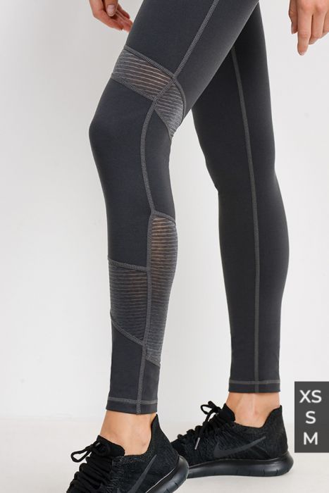 With its asymmetrical design, these sleek pair of leggings give a dynamic vibe. The right leg is solid whilst the left leg has ribbed mesh panels wrapping around the thigh and the lower leg. These come in Dark Grey only.