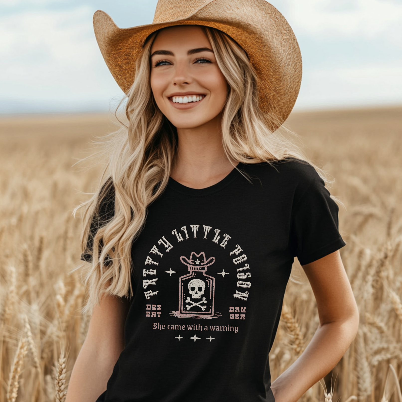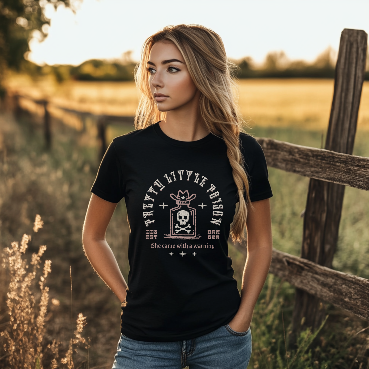 This Pretty Little Poison Graphic T-Shirt is made with soft, comfortable material and features a funny and playful design perfect for the trouble maker in you. Show off your country style with this charming t-shirt.
