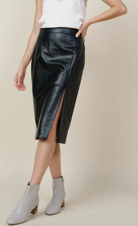 A pencil skirt looks infinitely cooler when it's made from vegan leather. This one sits high on the waist and traces the lines of the body before finishing below the knee, vented by an alluring front slit. An elasticized back waistband keeps it feeling comfortable.