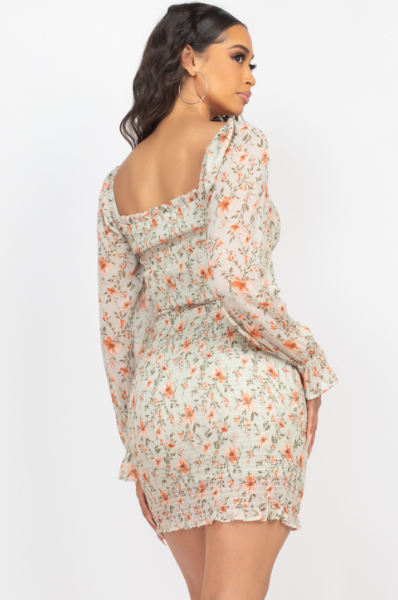 A floral patterned smocking mini dress featuring front ruched detail with self-tie drawstring, a square neckline with ruffle trim, long cuffed sleeves with peplum hem, and a ruffled hem.