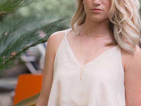 This lovely necklace is great for everyday wear! A beautifully polished hammered bar pendant hangs from delicate yet sturdy rolo chain creating a simple yet stylish necklace great for everyday wear. Necklace is shown in 14k Gold Fill on models at 24 inches long, but you can choose your perfect length from the drop down menu. It is layered with our Tilt Necklace and Bar Choker Necklace.