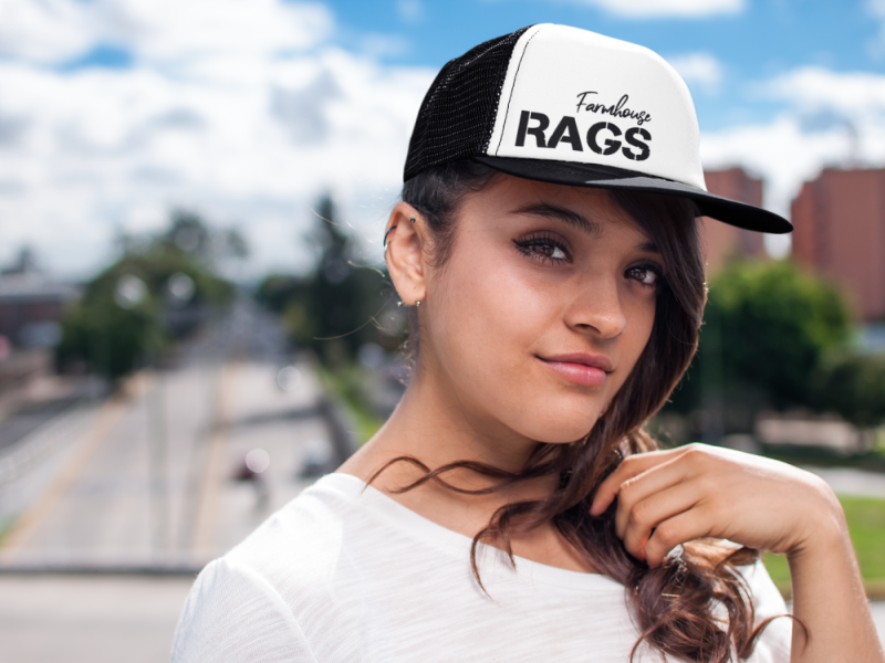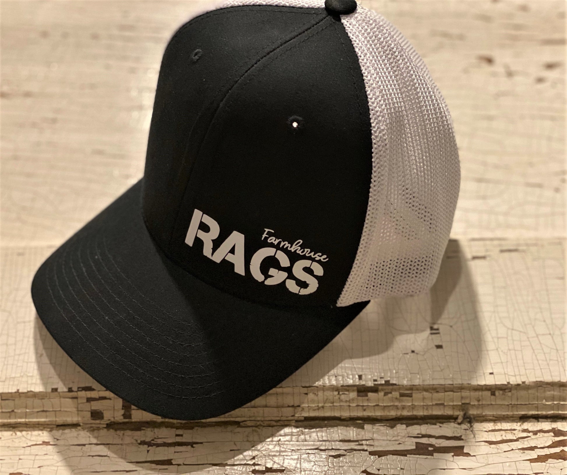 This white paneled tucker style hat has a netted backing and “Farmhouse Rags” in dark grey vinyl.